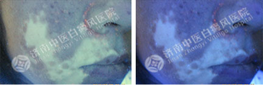 通过第一阶段治疗,王松的白斑得以控制,白斑边缘色素开始沉淀,不再扩散。继而采用308光治疗配合无针注射,针对病灶部位进行强化治疗,巩固第一阶段治疗的同时,激活病灶部位络氨酸酶活性,促进病灶部位黑色素细胞生长速度。